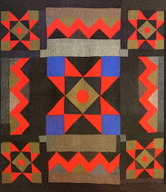 In 1681 William Penn devised a project to establish a Welsh Barony in what would later become Pennsylvania. Here members of the Society of Friends from Wales could live by their Quaker tenets free from persecution. And what is more: they could speak their native Welsh, which was not permitted under English rule. Pennsylvania became such a magnet for Welsh Quakers and Baptists, that there was a saying that there were more Welsh in America than Wales. Adept miners, Welsh labour would later supply the Pennsylvanian anthracite mining industry. It does not seem then too far-fetched to consider that the quilts and bedrolls the Welsh took with them to provide comfort and warmth should have an influence on Amish quilt development. This Welsh quilt is of pieced flannel, the sections of which might have originated from a tailor's sample book of serges, flanels and tweeds. Simply quilted it could originally have encased a worn blanket, or perhaps have been filled with fleece gleaned from hedgerows. Or, again, filled with fabric rags beyond use. Jen Jones, a collector and historian of Welsh quilts has written a wonderful book on the subject, and is producing another book in French. To visit her web-site simply click here.